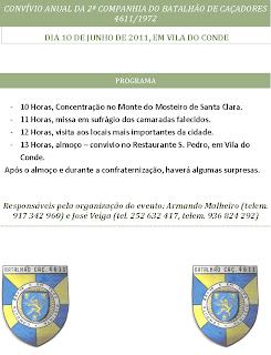 Ao longo do convívio, foi por demais salutar, como é da praxe, o recordar de "façanhas" feitas por actores principais os ex-combatentes, (todos nós) alegria estampada, no rosto de cada um, o que me deixou em certos momentos com um nó na garganta, pela satisfação que sentia por fazer parte desta grande geração que foi a nossa, onde tudo faltava, onde as condições de vivência, eram muito restritas, onde em certas alturas tínhamos que inventar, estávamos entregues a nós próprios. Tudo ultrapassamos, com maior, ou menor dificuldade... é por essas e por outras que ainda estamos cá, até um dia!...